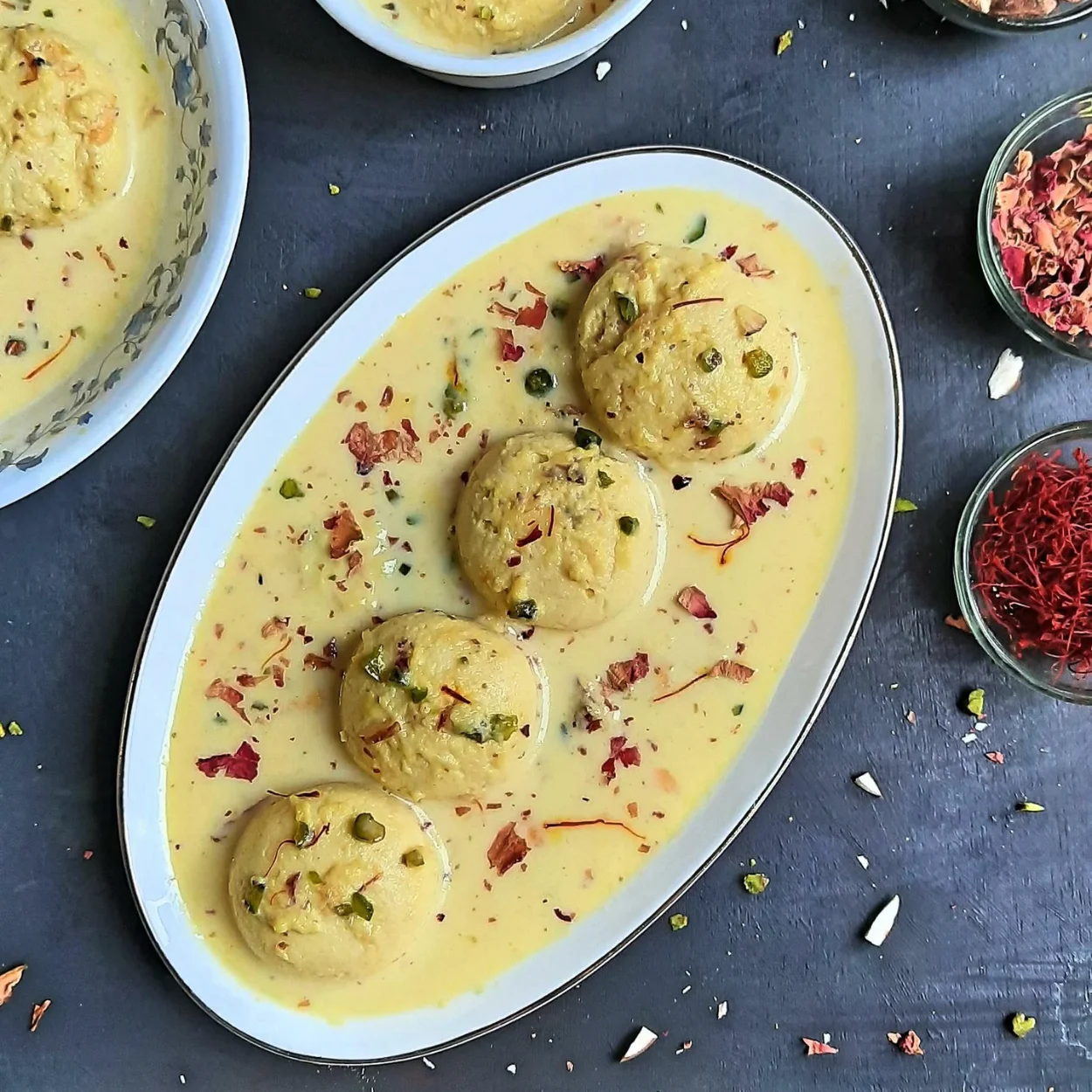 Delicate, velvety paneer discs soaked in chilled, sweetened milk infused with aromatic cardamom and saffron. Light, elegant, and incredibly refreshing