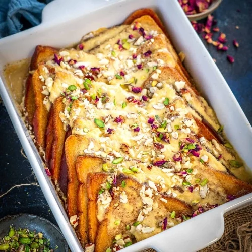 A royal Hyderabadi bread pudding soaked in saffron-infused milk, topped with crunchy nuts and aromatic cardamom. Rich, sweet, and traditional