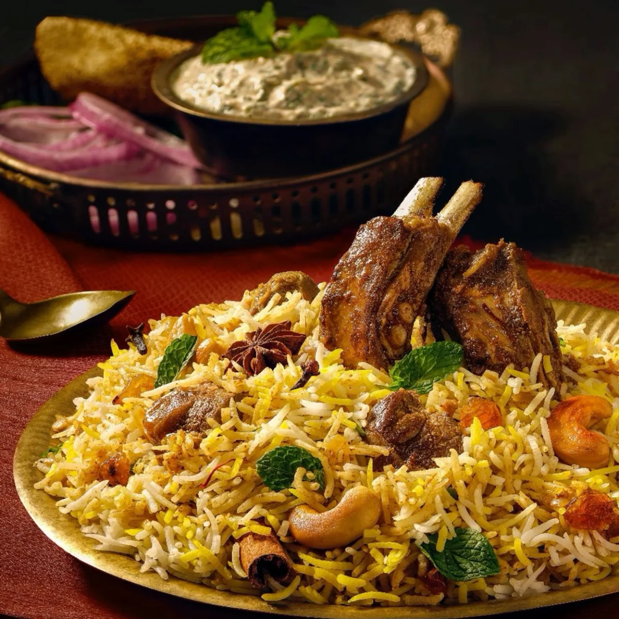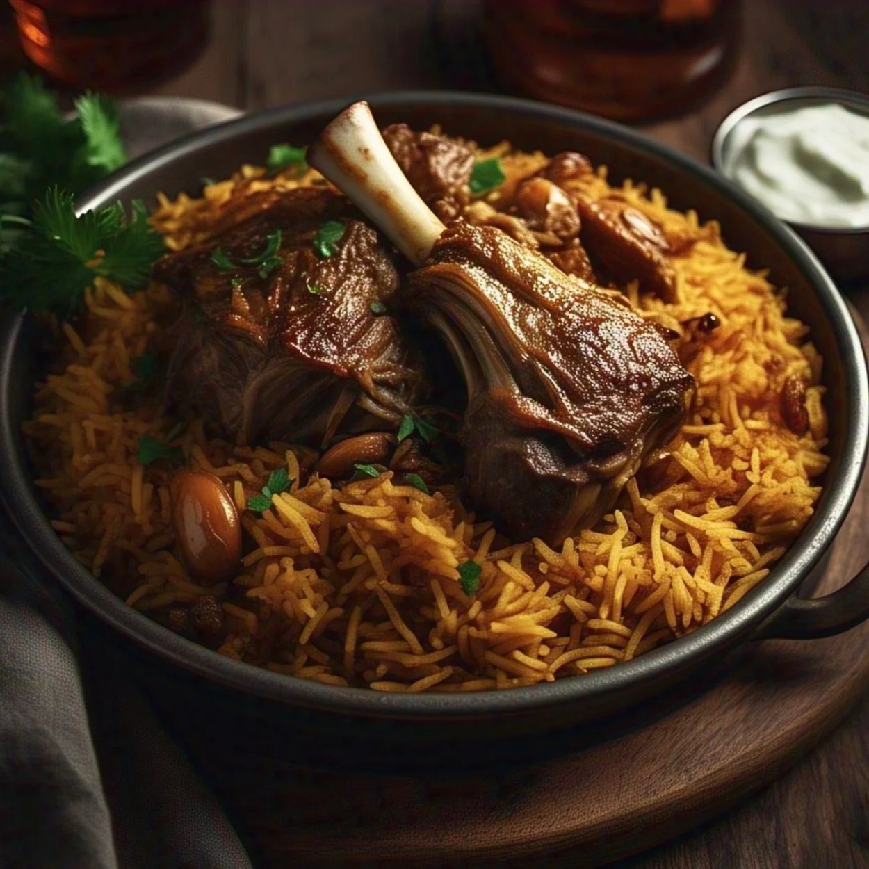 A celebration of flavor! Tender goat and fragrant basmati rice slow-cooked with aromatic herbs and bold spices. A hearty, traditional dish layered with rich, authentic taste.