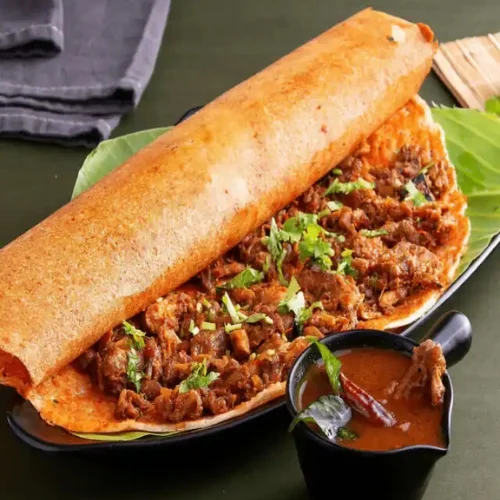 A crispy golden rice crepe filled with savory, slow-cooked minced lamb and aromatic spices. Served with sambar and house chutneys.