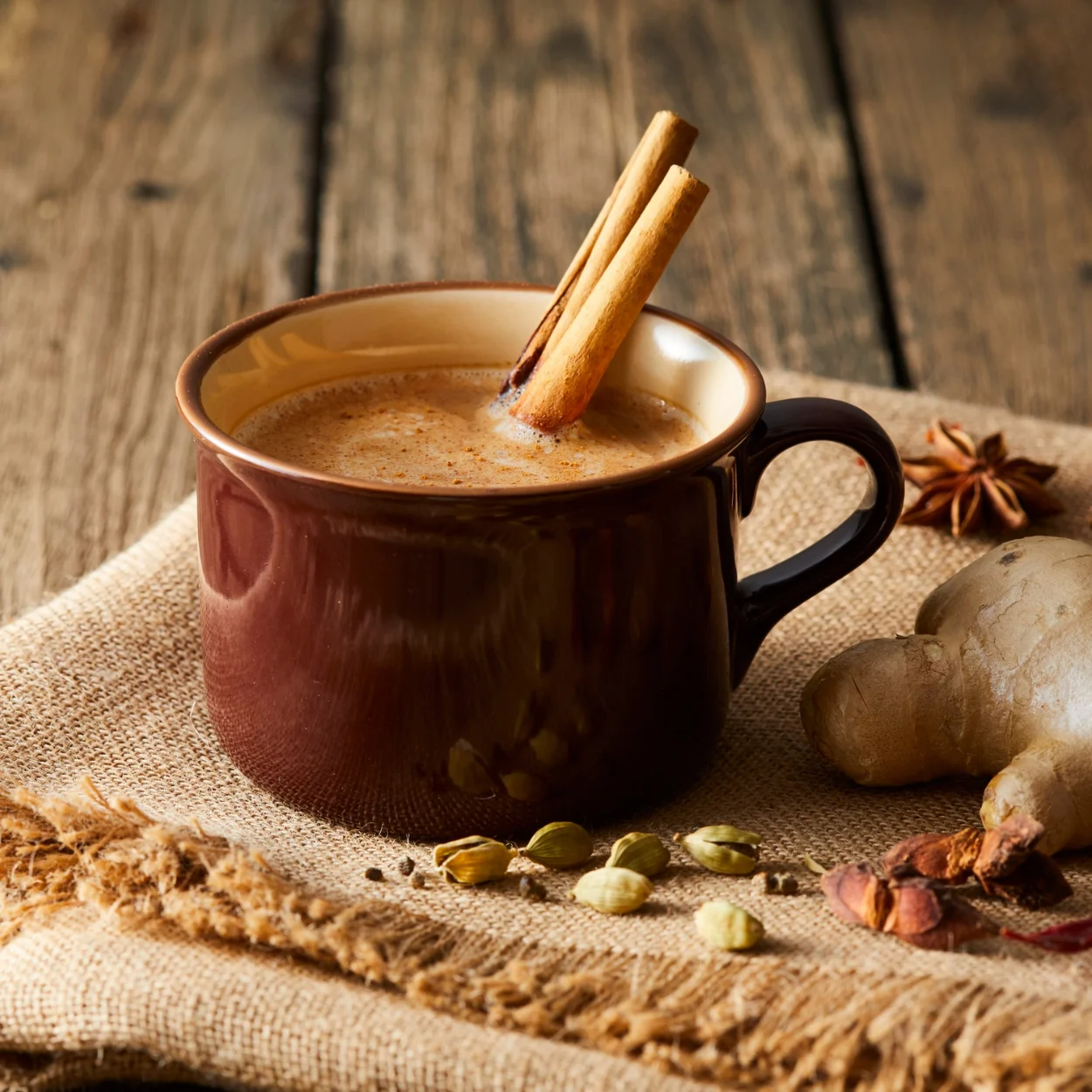 A warm, aromatic hug! Traditional Indian tea brewed with milk and a fragrant blend of spices like cardamom, ginger, and cloves. Bold, comforting, and perfectly spiced