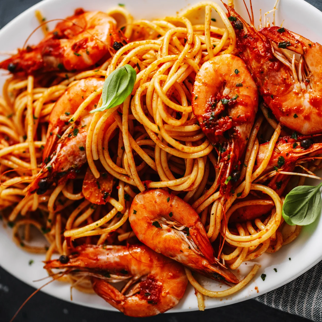 Juicy prawns in a mild and creamy coconut sauce, tossed with spaghetti. A South Indian twist on Italian pasta