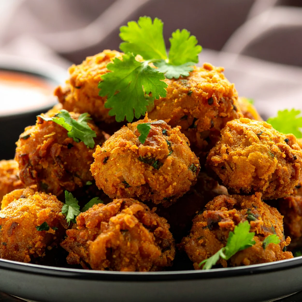 Crispy vegetable fritters dipped in a seasoned chickpea batter and golden-fried. A classic, crunchy Indian snack