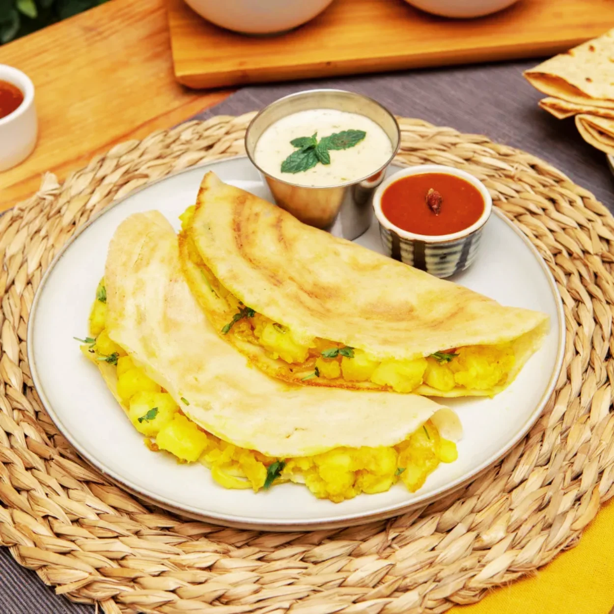 A thin, extra-crispy rice crepe filled with savory spiced potatoes and brushed with pure, aromatic ghee. A rich, buttery classic with an irresistible golden crunch