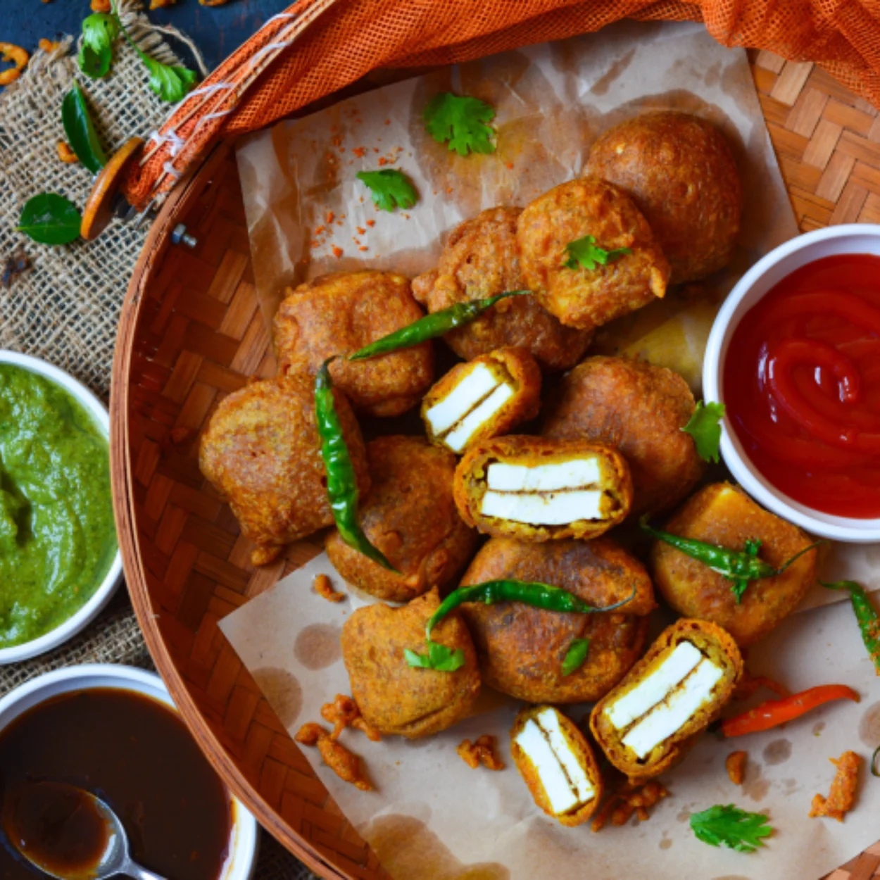 Soft paneer cubes dipped in a seasoned chickpea batter and golden-fried until crispy. A popular and savory snack