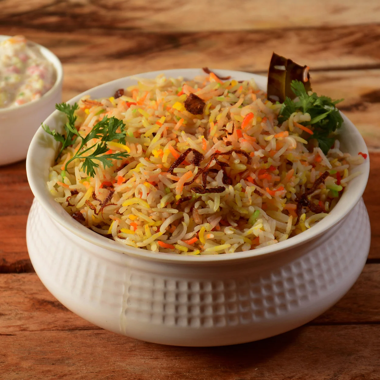 A vibrant garden blend! Fragrant basmati rice layered with seasoned vegetables, fresh herbs, and aromatic spices. Light, flavorful, and a true vegetarian classic