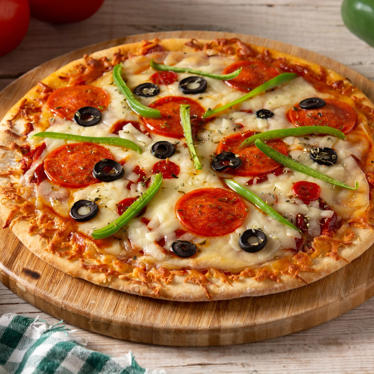 A crowd-pleasing classic! Topped with savory, spiced pepperoni and layers of melty cheese, baked until the crust reaches that perfect golden-brown with crisp, toasted edges.