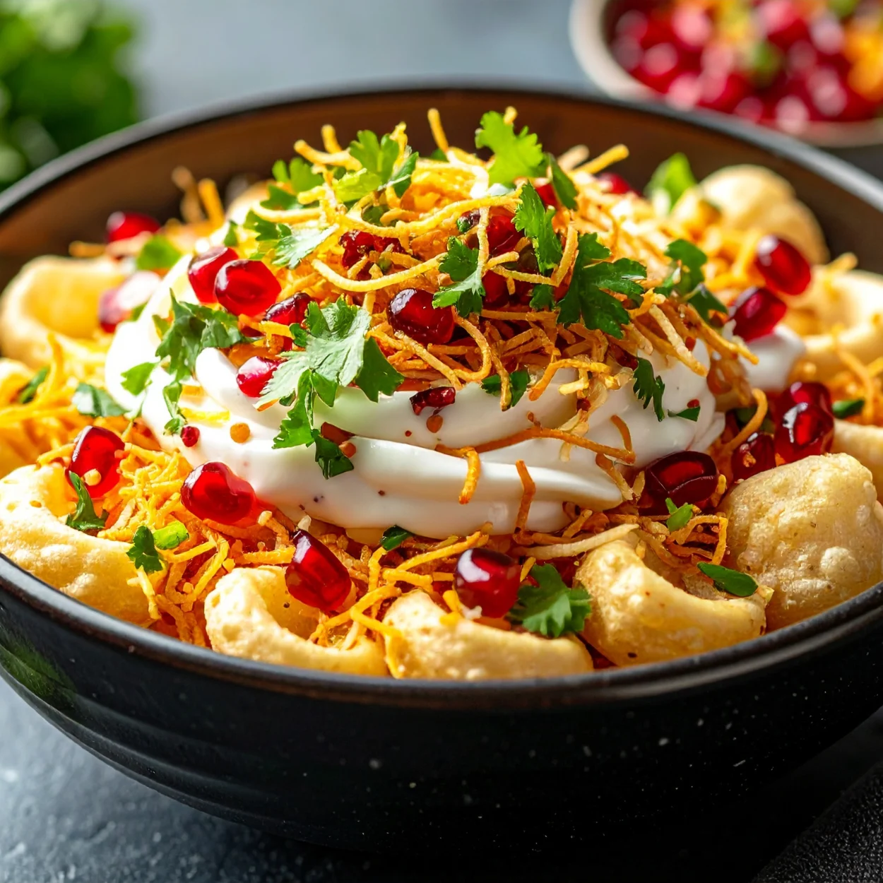 Crispy, spiced potato patties topped with tangy chutneys, cool yogurt, and fresh herbs. A warm and flavorful Indian street-food classic
